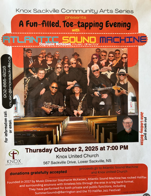 Since being founded in 2017 by Music Director Stephanie McKeown, Atlantic Sound Machine have rocked Halifax and surrounding environs with timeless hits through the eras in a big band format. Come to Knox for 7pm October 2 and experience their dynamic energy in person. From “Feeling Good” to “I’m Still Standing,” from “Autumn Leaves” to “Man! I Feel Like a Woman,” this evening promises to have you floating along the soundwaves for days to come. Our Director of Music John Lindsay-Botten takes a turn or two as guest vocalist, too! And note: dancing in the aisles is permitted.